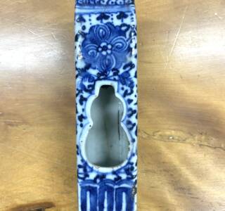 宣徳年製の小鳥の餌入れをお譲りいただきました。 青花磁器は日本でいう染付です。 幡憧(どうばん:細長い箱型の仏具)型で入口はひょうたんの形になっています。