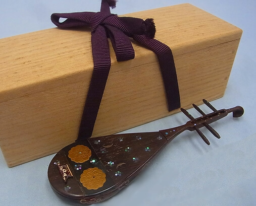 家業の傍ら、奈良の社寺が所蔵する美術品にヒントを得て、木工芸の茶道具を作り始めます。今回の正倉院の琵琶を模した作品もそのひとつで、その他にも社寺の古材を再利用したシンプルな作品を手がけました。