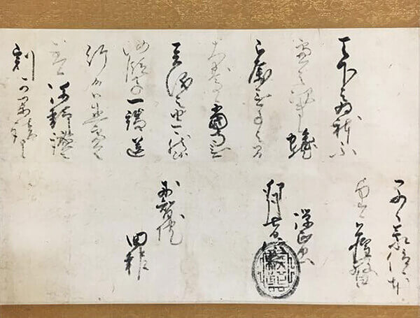 戦国時代には多くの大名がそういった印章を用いるようになりましたが、それ以前から使われていたサインの一種・花押(かおう)とともに据えられた物も多く遺されています。黒印状や朱印状、手紙などは古文書として保管されている場合もありますが、今回お買取のお品物のように表装を施し、掛軸とされている場合も多くあります。