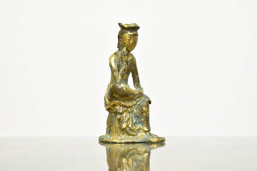 この度の金銅仏は、右足先を左大腿部に乗せて足を組み、組み右手の中指を頬にあてて物思いにふける姿の、半跏思惟像です。半跏思惟像の姿はインドで生まれて、中国、朝鮮半島を経て、日本に伝わりました。中国での半跏思惟像は、おもに六朝時代に出家前の釈迦・悉達多(しっだるた)太子が思索する姿として作られたものが多く見られました。日本の半跏思惟像は、朝鮮半島、特に新羅の仏像の影響を受けて造られ、作品に記された銘や資料から多くは弥勒菩薩と考えられています。半跏思惟像は大変人気のある姿の一つで、京都・広隆寺や奈良・中宮寺などに安置されている仏像が有名です。