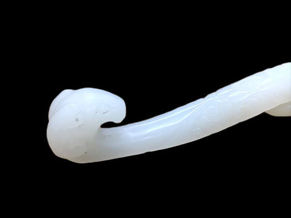 こちらの品は獣頭玉製帯鉤です。美しい白い玉に文様の彫刻が施された一品です。