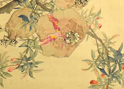 お買取りの掛け軸は、天に向かって流線形に伸びる枝葉に、可憐な花々や果実が瑞々しく描かれており、伸びやかで清々しい作品です。