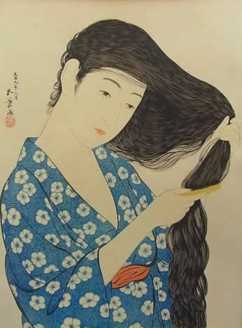 「髪梳き(髪梳ける女)」は代表作のひとつとされ、女性の髪や肌、浴衣の生地の質感や量感が伝わってくる作品です。