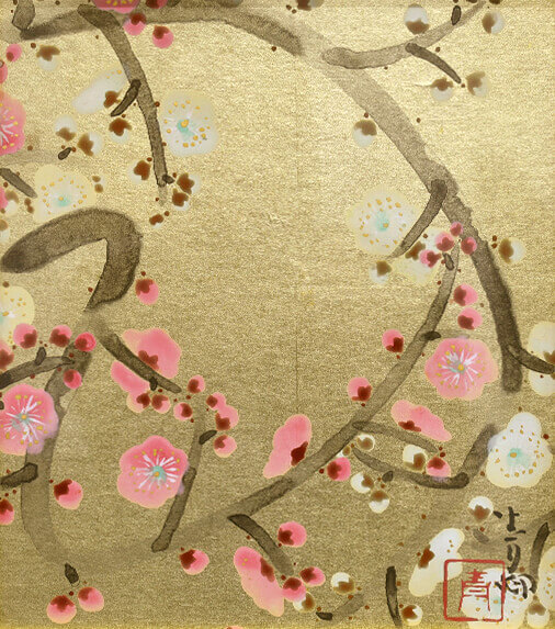桃色と白色の梅は初春の喜びをもって愛らしく金地に映える。