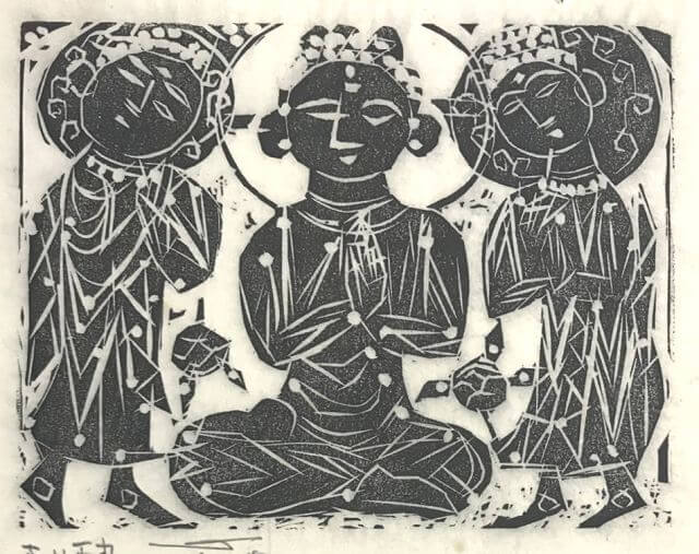 棟方は生涯に数多くの仏画を手掛けていて、「三尊仏の柵」という作品はこのほかにも存在します。