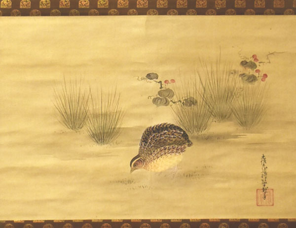 今回の掛け軸は、草むらで餌をついばむ鶉が一羽描かれていますが、江戸中期の国学者、橋本経亮は著書『梅窓筆記』で、光起の鶉の絵に猫が飛びかかったという伝承を記しているほど、光起は鶉を得意としていました。