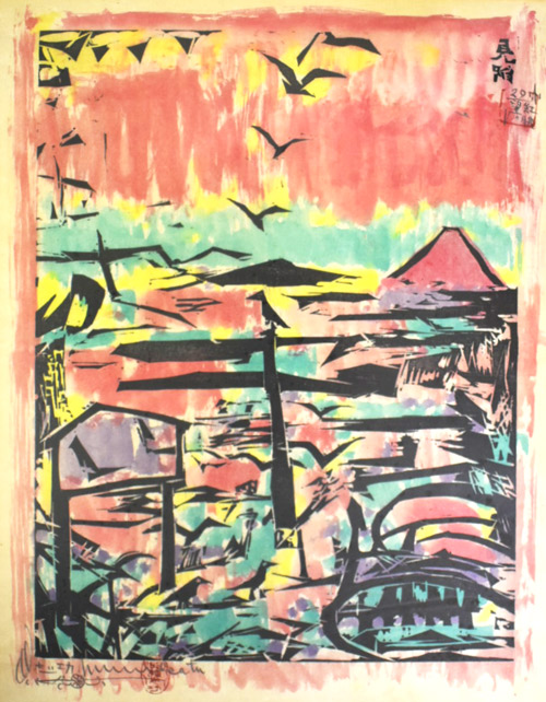 棟方志功「東海道棟方板画」より「見附 紅眺望の柵」です。