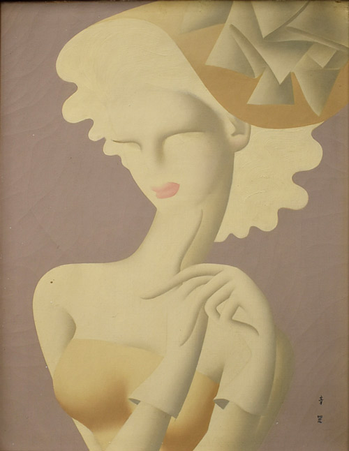 今回の作品は、薄く瞳が描かれた目が開いている女性像で、晩年は目を閉じた女性像がほとんどであったことから、若い頃の作と思われます。