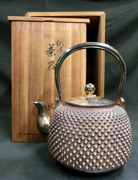 銀瓶は茶の湯の世界で育まれ純銀を使用し贅沢かつ使いやすさにこだわったアイテムで、現在でも安定した価格で取引される骨董品です。 今回の銀瓶は霰(あられ)と言われる突起が一面についた品で、この突起をひと...