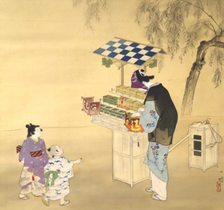 伊藤小坡(いとう しょうは)は日常風俗や、歴史・物語を主題とした女性像を描いた女性日本画家です。 日常風俗を描いた「虫売」は、虫売りの女性と屋台、子供たちが繊細に描かれています。 伊藤小坡は同...