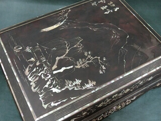 朝鮮工芸実習所謹製 螺鈿山水画賛 硯箱です。 螺鈿は漆工芸品の加飾法の一つです。螺は貝、鈿は物を飾るという意味で、主に夜光貝、蝶貝、アワビ、アコヤガイなどが使われます。貝殻の内側、虹色光沢を持っ...
