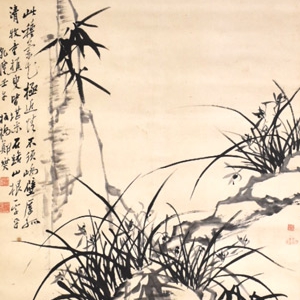 鄭板橋(鄭燮)の掛け軸です。 鄭板橋は詩書画すべて良くした中国清の時代の文人で、書は行・楷に隷を交えた「六分半書」、画は蘭竹画を得意としました。 この掛け軸も得意とした蘭と竹が描かれています。