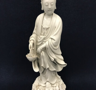 明代の徳化窯魚藍観音菩薩像です。 徳化窯(とっかよう)は、中国福建省永春州徳化の磁器のことで、明・清代に盛んになりました。 日本ではいわゆる白高麗(はくごうらい)といわれる白磁で、透明度と玉の...