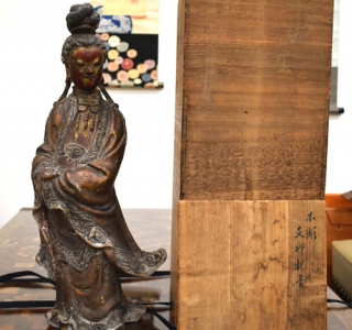 目じりが上がった顔立ちと衣の動きが特徴的な中国清の時代の観音像です。 古いお宅には清朝末期の売り立てで日本に入ってきた仏像や絵画・骨董が残っていることがございます。 もし気になるお品がございま...