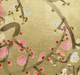 前田青邨の紅白梅図です。 前田青邨は梶田半古の画塾にて、古典文学を学びながら小林古径とともに有職故実や絵巻物の模写に励みます。 明治40年には靫彦らの紅児会に参加。院展を舞台に活躍し、巧みな構...