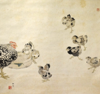 小杉放庵の掛け軸です。 小杉放庵ははじめ洋画を学び、渡仏後はシャヴァンヌなどの影響をうけた作品を発表し、次第に水墨画に傾倒、放庵と改号し日本画を描くようになります。 今回の作品は、雛を見守る雌...