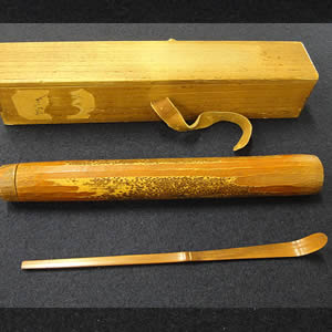 茶道具の中でも箱や書付が特に重要となるお品、それが茶杓です。書付がある筒・箱を備えた茶杓で、そのほかお持ち込みされた茶道具と一緒に買取りとなりました。
