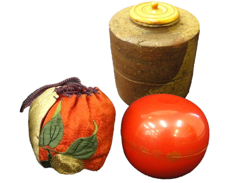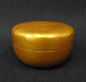 薄茶を入れる容器には棗形と中次形があります。他の薄茶器にくらべて全体として丸みをもつ棗は、黒梅擬科の植物の棗(ナツメ)の実に形が似ていることに由来しています。大きさや形状が多様で、表千家好み・裏千家好みだけでなく宗匠ごとにも好みがありますが、大きく珠光棗、紹鴎棗、利休形棗に分けられ、その内一番小さい利休形棗が現代の定型となっています。陶磁器の濃茶に対し、薄茶器では漆器や一閑張、その他に木地・竹などが用いられます。漆器には京塗や輪島塗・春慶などがあり、真塗や溜塗、雅やかな蒔絵や沈金を施したものなどその意匠は豊富で、季節や茶会の趣旨にあわせた楽しみが広がる道具のひとつです。
