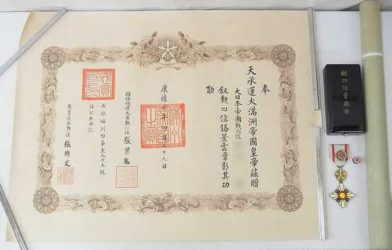 満州国の勲章は1934年(康徳元年)に定められました。製作は日本の造幣局が行い、皇帝溥儀の意見もデザインに採り入れられました。勲位は、大勲位及び勲一位から勲八位までとなり、大勲位蘭花章頸飾、大勲位蘭花大綬章、龍光大綬章、景雲章が定められました。これに1936年(康徳3年)柱国章が加わっています。満州国の勲章は授与された期間も短く貴重です。