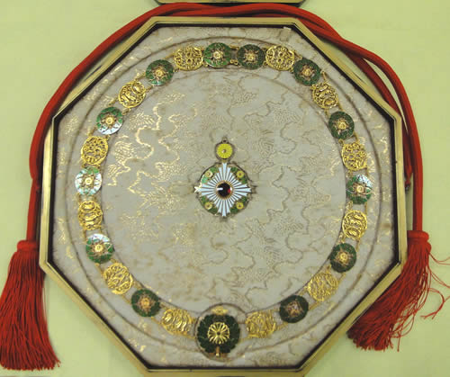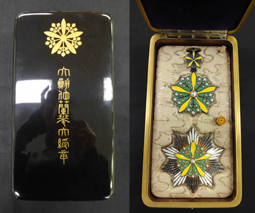 日本の最高位の勲章です。部品はすべて22Kで八角形の塗箱に収まっています。天皇陛下が新年祝賀の儀などの際に身につける勲章として知られ、数少ない受賞者には外国元首が多く含まれ、皇族の他には一部の総理大臣経験者に限られます。大勲位菊花章頸飾に次ぐ勲章として、大勲位菊花大綬章があります。