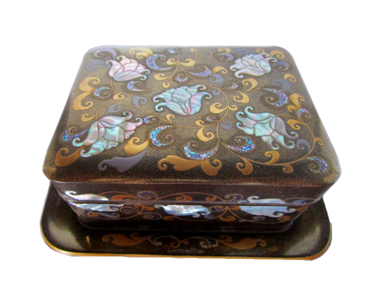 蒔絵の技法には粉の粒子が荒かった平安時代まで主流であった研出蒔絵や、平蒔絵、高蒔絵、研出蒔絵と高蒔絵を同時並行で制作する肉合蒔絵、卵殻蒔絵などいろいろな技法があります。 -