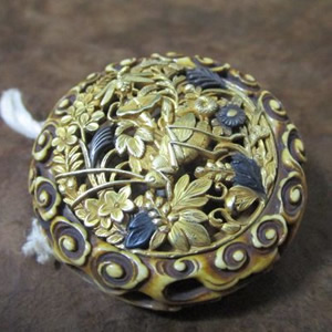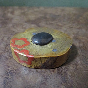 印籠は薬などを携帯するための小さな容器のことで、紐(緒締め=おじめ)を通して、落下防止用の根付けで留め、紐を帯に挟んで使用しました。漆器、陶磁器、金属製、竹製などの素材が使われ、螺鈿や蒔絵などの精巧な装飾がされた印籠は高額で取引されます。