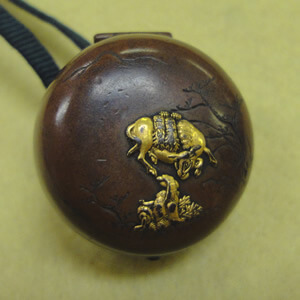 根付とは、江戸時代に煙草入れ、矢立て、印籠、小型の革製鞄などを紐で帯から吊るし持ち歩くときに用いた留め具をさします。根付・印籠の素材は、蒔絵などの木製や陶製、象牙、猪やセイウチの牙、鹿の角、骨、金工、琥珀、珊瑚等など多岐に渡ります。