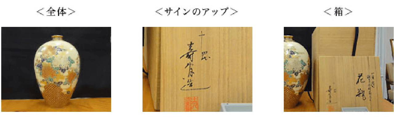 - お品物全体・作品の裏側・サイン、落款のアップ・箱があれば箱・欠けや汚れがあればその部分のアップ を撮影してください。